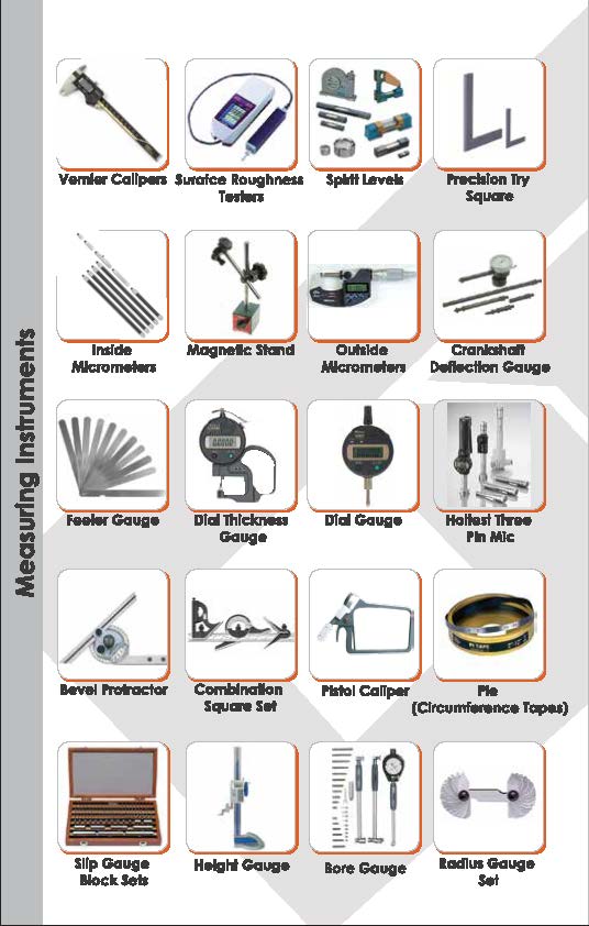 Catalogs Testing Inspection & Measuring Equipment - Safety Tools Precision Measuring Instruments Micrometer, Vernier Caliper, Height Gauge, Bore Gauge Slip Gauge Set, Dial Thickness Gauge Coating Inspection & Paint Testing Equipment Digital Coating Thickness Gauge, DFT Meter, Wet Film Gauge WFT, Holiday Detector, Press o Film, Surface Comparator , Surface Profile Gauge, Dew Point Cross Hatch Cutter, RAL Shade Cards, Weld Gauges Electrical & Testing Instruments Digital Multimter, Tong Tester, Ultrasonic Thickness Tester, Hardness Tester, Sound Meter, Anemometer Infrared Thermometers, Lux Meter Non Sparking (Anti Sparking) Safety Tools Sockets, Spanner Sets, Screw Drivers, Pipe Wrenches, Hammers, Chisel, Pliers, Cylinder Keys, Bung Wrenches Industrial Tools Pipe Bending Machine, Hydraulic Jacks, Grease Guns, Pressure Test Pumps, Crimping Tools, Tool Trolleys Torque Wrenches Torque Wrenches (Manual / Hydraulic / Dial Type) Workshop And Machine Tools Spring Calipers, Divders, Try Square, Tap Wrenches, Screw Pitch Gauge, G-Clamps, All Types of V-Blocks