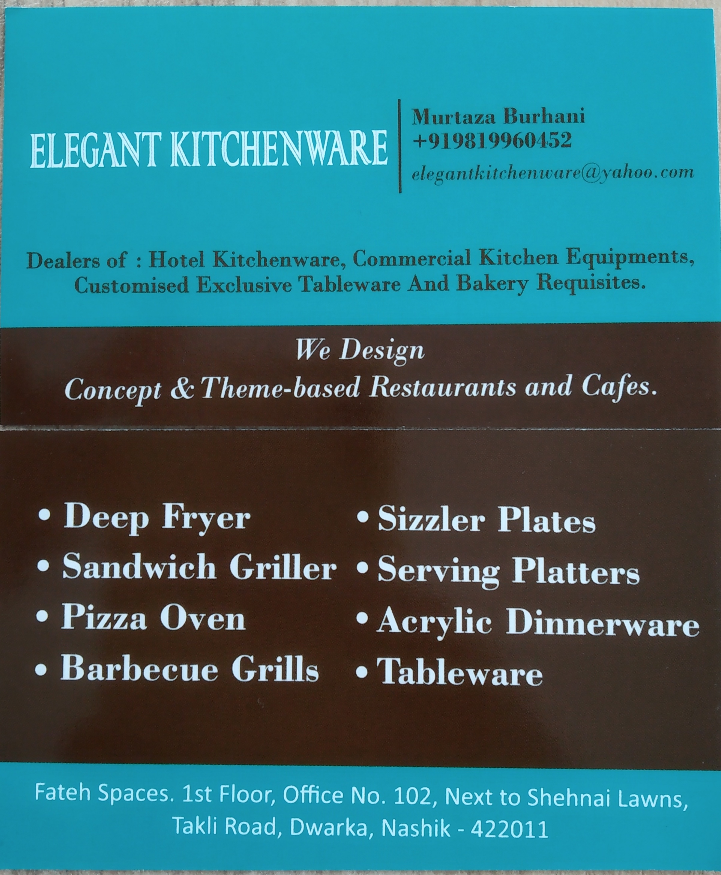 We "Elegant Kitchenware" , established in the year 2005 as a Dealer and Supplier of Restaurant and Hotel Kitchenware, Kitchen Equipments and Bakery Requisities. Our products have attained praise and credibility of clients for their high quality and sustainability. We have grown from strength to strength and has now ventured into designing Theme based Restaurants and customizing Kitchenware as per Clients'needs. Our aim is to provide unique and creative ideas in the field of Restaurant designing while maintaining international standards.