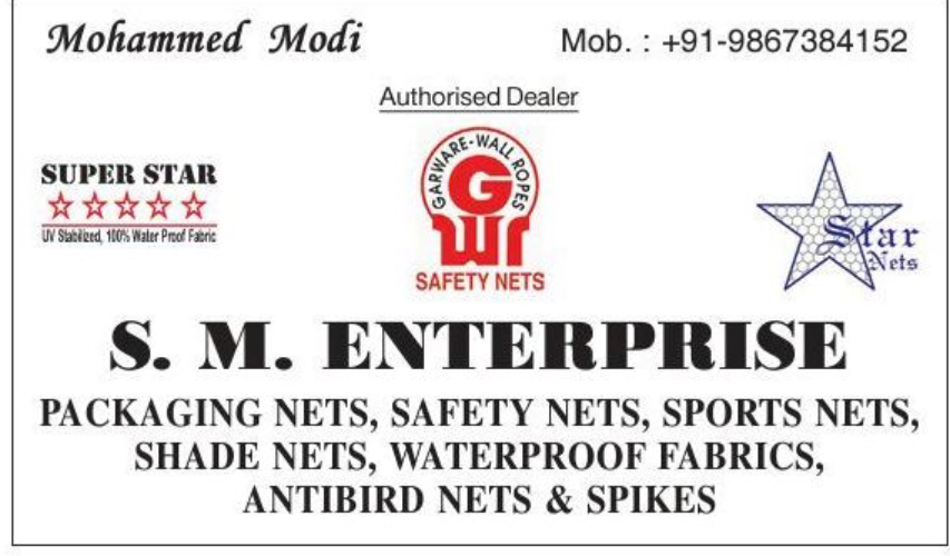 Incepted in the year 2006, S.M. Enterprise is a sole proprietor firm and is engaged in manufacturing and trading an extensive variety of - Construction Nets, Safety Nets, Packaging Nets, Anti Bird nets, Bird Spikes, Tapaulins, HDPE Waterproof fabrics and Shade Nets. We are authorized dealers and stockiest of Garware Safety nets and Bird nets, Garware is pioneer in the manufacturing of world class ropes and nets for the safety industry, fishing industry and sports industry, it exports in more than 80 countries and is the best in India. We have our Super Star brand of waterproof fabrics which is virgin and UV Stabilized for maximum life. Our 125 GSM is stronger than 250 GSM of any local brand. We also build a range of challenging monsoon sheds for rain protection. We undertake installation services of anti-bird nets, Anti Bird spikes and safety nets at industrial and domestic sites. We produce metal, acrylic and other plastic items according to the client's requirements using plastic injection or blow molding processes, concerning to the display industry. Our manufacturing unit is empowered with sophisticated technology and machines that facilitate us to fabricate our series of products as per the international standards. The commitment, efficiency and in-depth knowledge of our experts have helped us in offering our collection as per the precise requirements detailed by our clients. We productively cater to many reputed FMCG, pharmaceutical, automotive, retail, bottling & construction industries across the country. To meet the bulk requirements of clients we also guarantee that we keep utmost stock of all usually demanded products. We make sure that our manufacturing methods as well as our products are environmental friendly. Our professionals are capable and have in-depth knowledge in the sphere that facilitates us to complete all the business processes smoothly and sustain amiable relation with clients as well as with our vendors.