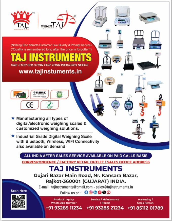 We at TAJ INSTRUMENTS are a team of passionate people who believe in constant innovation and updation of technology as per the needs and demands of customers. We have embarked on the Journey, after our extensive experience through our firm NATIONAL STORES, after dealing with all kinds of Weighing and Measuring Instruments for more than 43 years, and having understood all the important aspects of customers’ needs and to offer products and services as per their requirement. Our focus is to bring the best quality products to our customer’s at the most competitive price. We at TAJ INSTRUMENTS believe in doing things right the first time, as there is no alternative to Best Quality in today's competitive world. We bring this commitment of Excellent Quality and Services in all the business aspects.