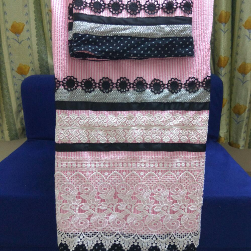 Baby pink popcorn material with heavy Bangkok gpo lace all over