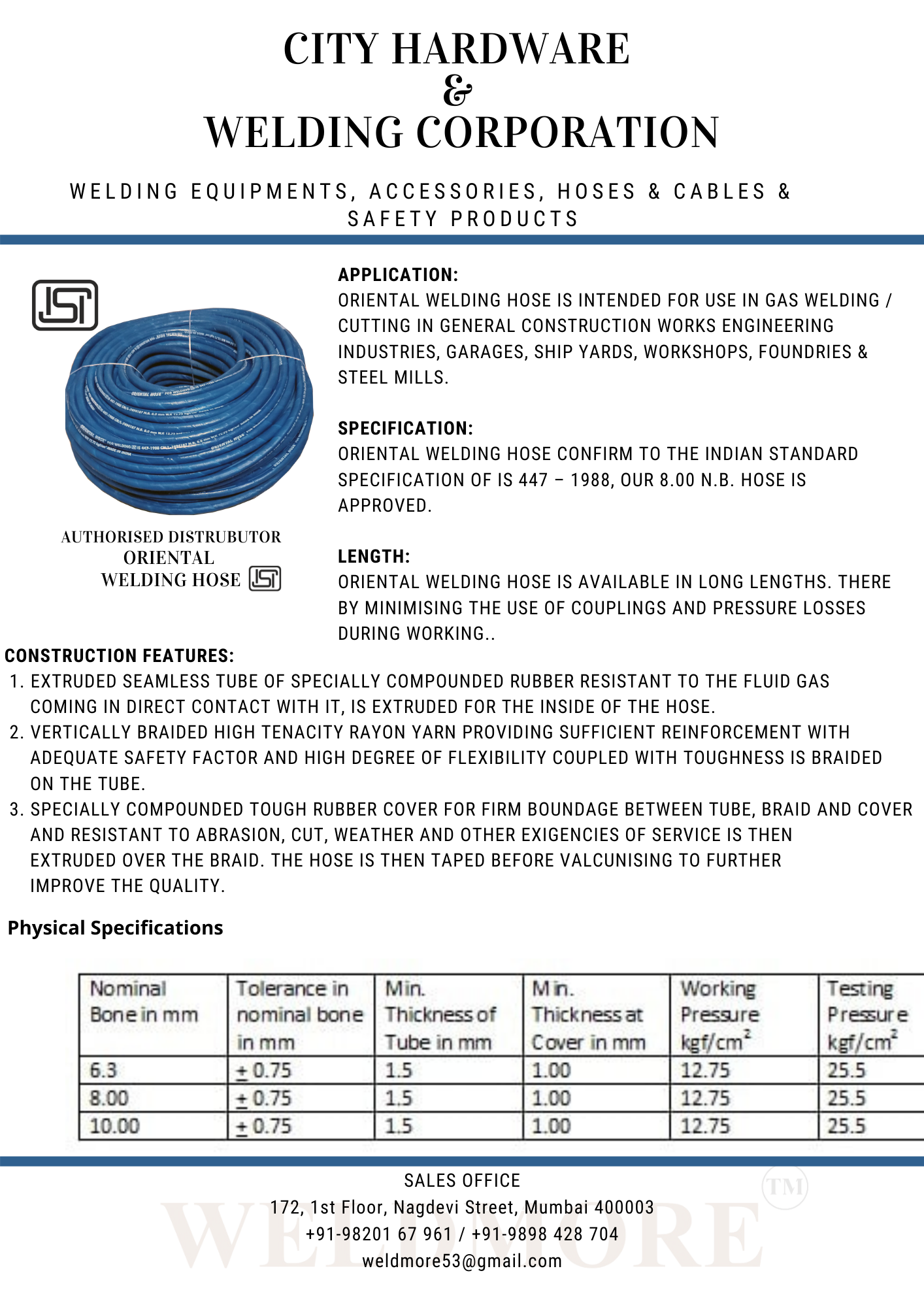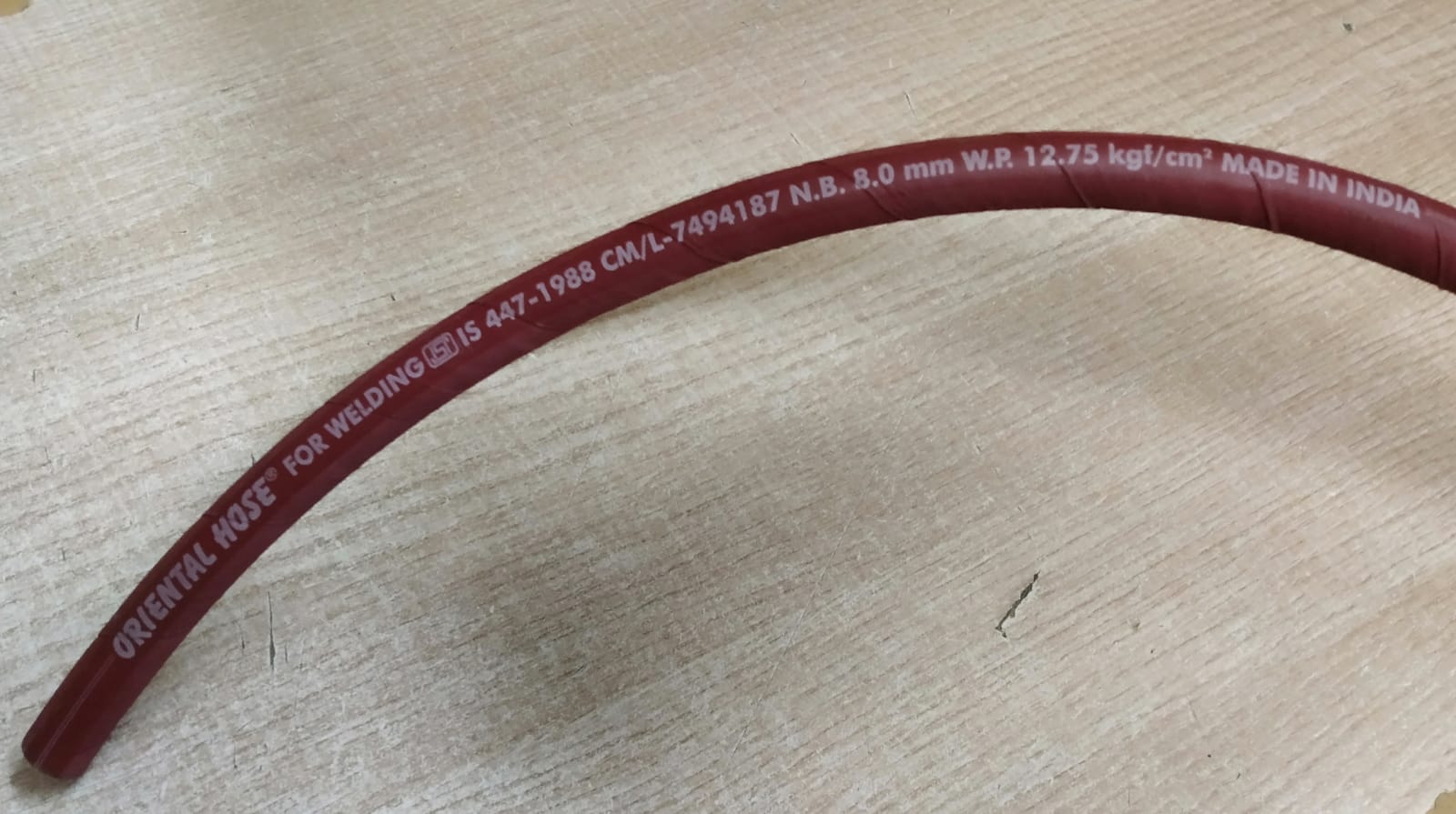 SPECIFICATION: ORIENTAL WELDING HOSE CONFIRM TO THE INDIAN STANDARD SPECIFICATION OF IS 447 – 1988, OUR 8.00 N.B. HOSE IS ISI APPROVED.